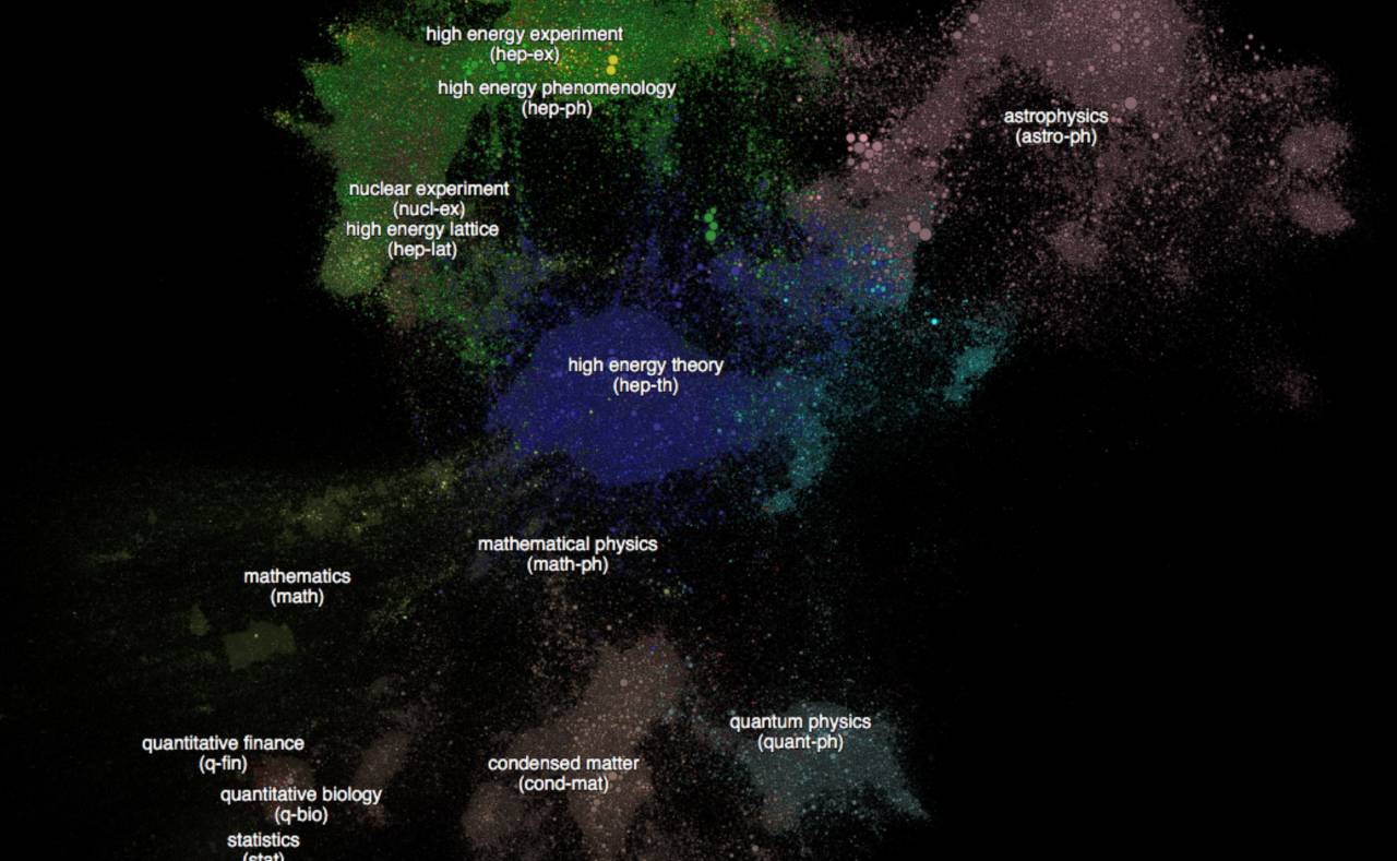 有意思的是,高能理论物理学(hep-th,大片的蓝色区域)位处地图的中央。这一部分的理论物理奠定了许多基础物理学的根基,因此它将许多学科如高能物理现象学(实验结果的预测和研究)、天体物理学、凝聚态物理学、量子物理学以及数学的部分领域连接到一起。然而,身处地图的中心也伴随着一些缺点。由于理论物理学之间的交织十分紧密,因此不同于其他领域的分类,它很难被分离出单独的子课题。