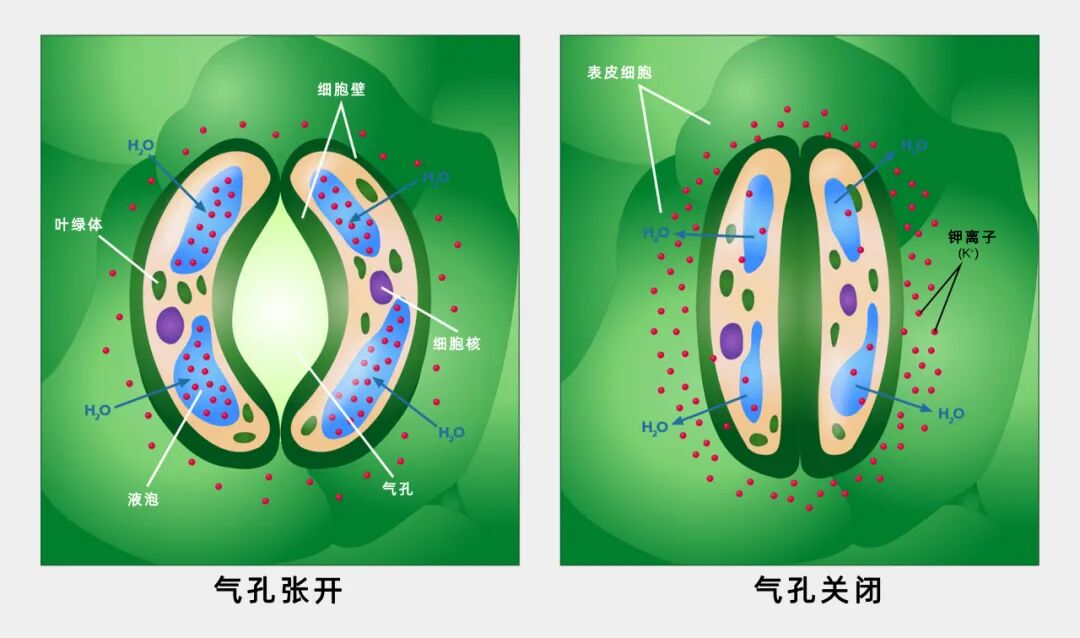 气孔是叶子和茎表面的细小孔隙,当它们打开时,可以吸收二氧化碳,关闭时则能尽量减少水分流失。