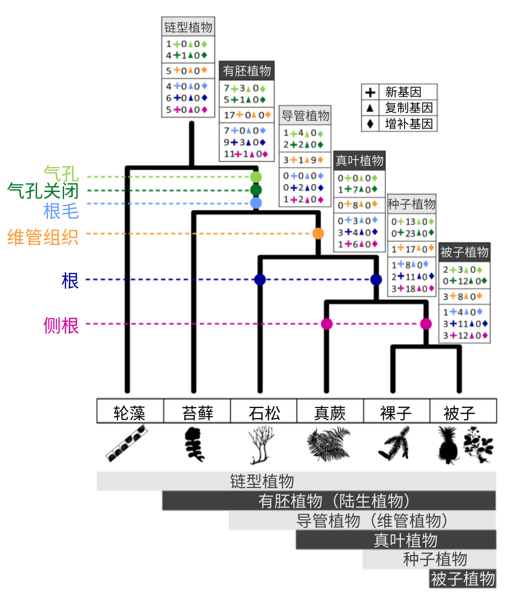 植物与水的关系是以循序渐进的方式演变的。这张图展示了植物的进化关系,下方的黑色剪影说明了每个类群的物种。指向不同的水调节创新点的虚线表示它们的起源,每种颜色对应着一个创新点,说明与每种创新相关的遗传机制。符号说明显示了方框内的新基因、复制基因和增补基因的数量。主要的植物类群在底部以色块分类。从图中可以看出气孔、维管组织和根的相关基因在进化中采用了不同“策略”。| 图片来源:Bowles, A. et al. (2022)
