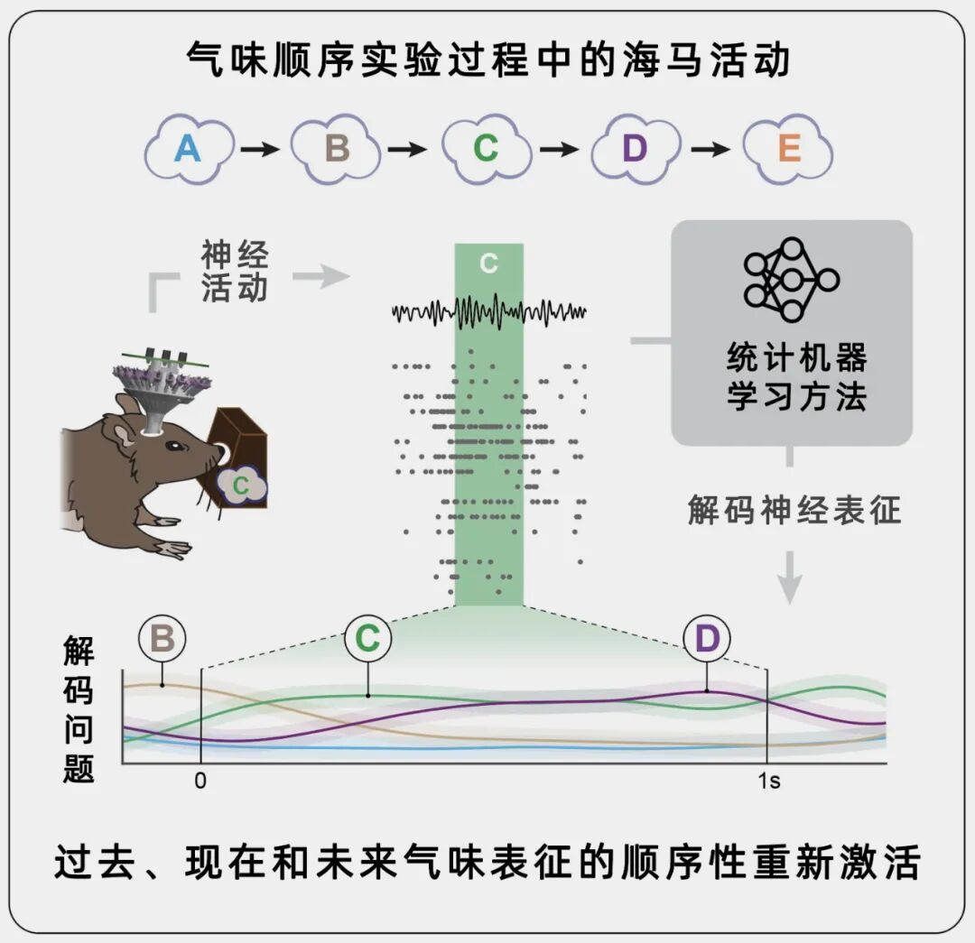通过这种方式,研究人员能够对神经元的放电模式进行解码,从而检索信息。他们发现,特定的气味特征也会在不同时间点上重新出现,比如,当实验中的大鼠正在思考未来,期待尚未发生的事情时,一些特征就会被快速重放。这些结果证明,海马网络的一个基本功能正是编码、保存并预测经验的顺序。
