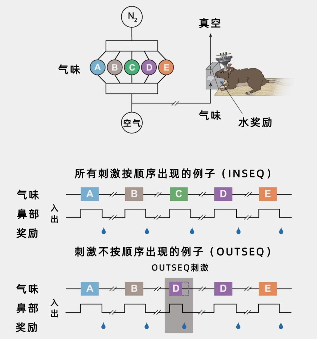 他们向大鼠分别“按顺序”(InSeq)和“不按顺序”(OutSeq)释放了5种不同的气味,大鼠需要通过鼻部的行为反应,正确识别每一种气味是否按顺序出现,从而获得水奖励。