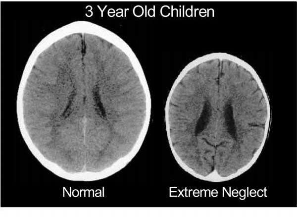 正常3岁幼儿的大脑(左)和遭受长期感觉剥夺的3岁幼儿大脑(右)在CT扫描中的对比,长期的忽视让幼儿的大脑更小(百分位为3%)且脑皮质萎缩。图片来源:doi.org/10.1023/A:1016557824657