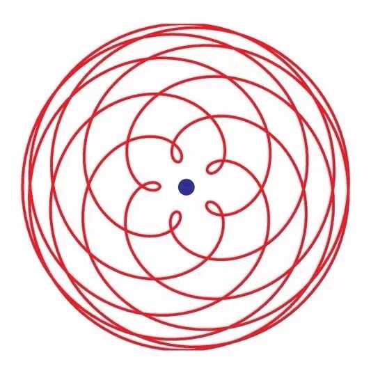 让我们再来看另一张图。太阳固定在中心,暗黄色的是金星,蓝色的是地球。红色的线将地球和金星连起来,而中点的轨迹也会形成“金星玫瑰”曲线。上面几幅图略有不同,但没有本质区别,因为它们显示的都是相对运动。