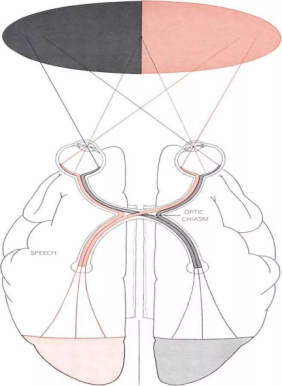 二,语言中枢位于左半脑。因为当我们讲“FACE”投影到屏幕一侧时,按照上图,“FACE”这一视觉信息被传递到了对侧半脑,然而因为此时胼胝体被切断,左右脑失去了联系,信息将会停留在当前半脑中,这半脑只能调用自己可以的功能而不能借用另一半大脑的功能。所以当单词投影在屏幕右侧,被试者能说出名词;而投影在屏幕左侧被试者只能说“什么也没看到”。这一现象说明只有左脑拥有着语言中枢。