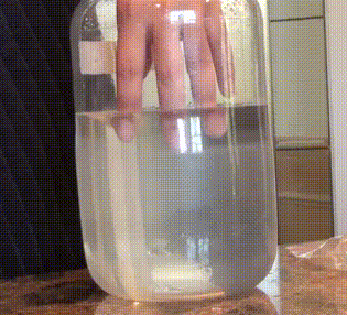 看起来很恐怖,其实不是真的冰,只是醋酸钠过饱和溶液而已。过饱和溶液是溶质超出溶解度上限的不稳定状态,稍加扰动就会大量析出沉淀。如果把三水合醋酸钠晶体加热到熔点(约58摄氏度),晶体会一边熔化、一边释放出结合的水,然后熔化的醋酸钠又会溶化在释放出来的水里,成为很浓的溶液。将这些溶液冷却到室温下也不会析出,而是变成过饱和溶液。现在如果伸手进去形成凝结核,溶质会立刻重新结晶为三水合醋酸钠晶体,这一过程带走的水又促进了进一步结晶,很快整瓶都会完全变回一开始的样子——一堆白色晶体,没有一点游离水