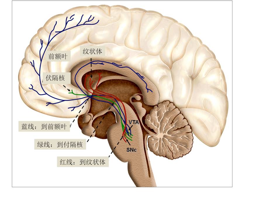 图1. 脑中的多巴胺线路。多巴胺由VTA区产生,通过三个基本路径到达不同脑。图中的蓝色线路通往前额叶,是自我奖励的主要结构。红色线路进入“纹状体”协调动作定势的形成(如学会骑车,滑冰)。绿色进入“伏隔核”(NAcc)。伏隔核抑制VTA多巴胺分泌,使欣快的感觉有所节制。比如调控如笑的持续时间,“有朋自远方来,不亦乐乎”(人来疯)这种感觉的激烈程度。