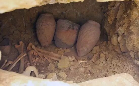 ▲建造埃及金字塔的工人的坟墓以及里面的陶罐。这些工人的墓穴建造于埃及第四王朝(公元前2575-2467年间)。奴隶是不可能有坟墓的。考古学证据还显示,这些工人(大约1万人)每天会吃21头牛和23头羊。