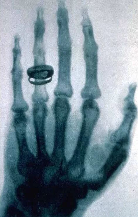 伦琴拍摄的一张X射线照片,伦琴夫人的手骨与戒指