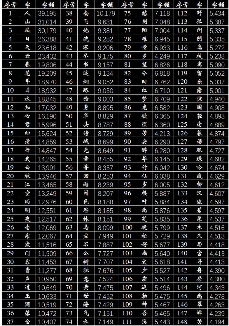 首先,让我们来看看去掉这些虚词之后的全局高频字有哪些,笔者这里展示的是TOP148。“人”字排行第一,这体现了《说文解字》里所讲的“人,天地之性最贵者也”,说明唐诗很好的秉承了“以人为本”的中华文化。而后续的“山”、“风”、“月”、“日”、“天”、“云”、“春”等都是在写景的诗句里经常出现的意象