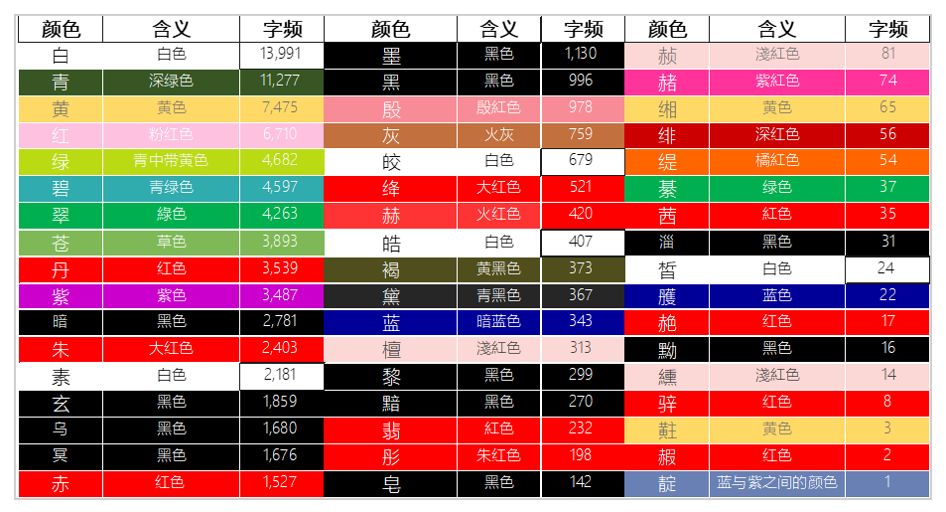 笔者在这里找了51个古语中常用的颜色的单字(注意是古汉语语境中的颜色称谓),其中以红色系(红、丹、朱、赤、绛等)、黑色系(暗、玄、乌、冥、墨等)、绿色系(绿、碧、翠、苍等)及白色系(白、素、皎、皓等)为主,这些颜色及其对应的字频如下表所示:
