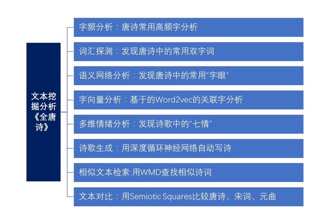 接下来,笔者将使用多种文本挖掘方法,来分析《全唐诗》。以下是本文的行文脉络: