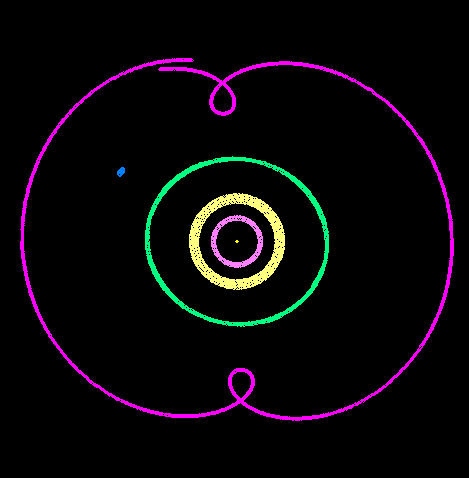冥王星和海王星2:3共振。将海王星(蓝点)和太阳(中央黄点)固定。由内向外依次是太阳,木星(粉色),土星(黄色),天王星(绿色),海王星,冥王星(紫色)。
