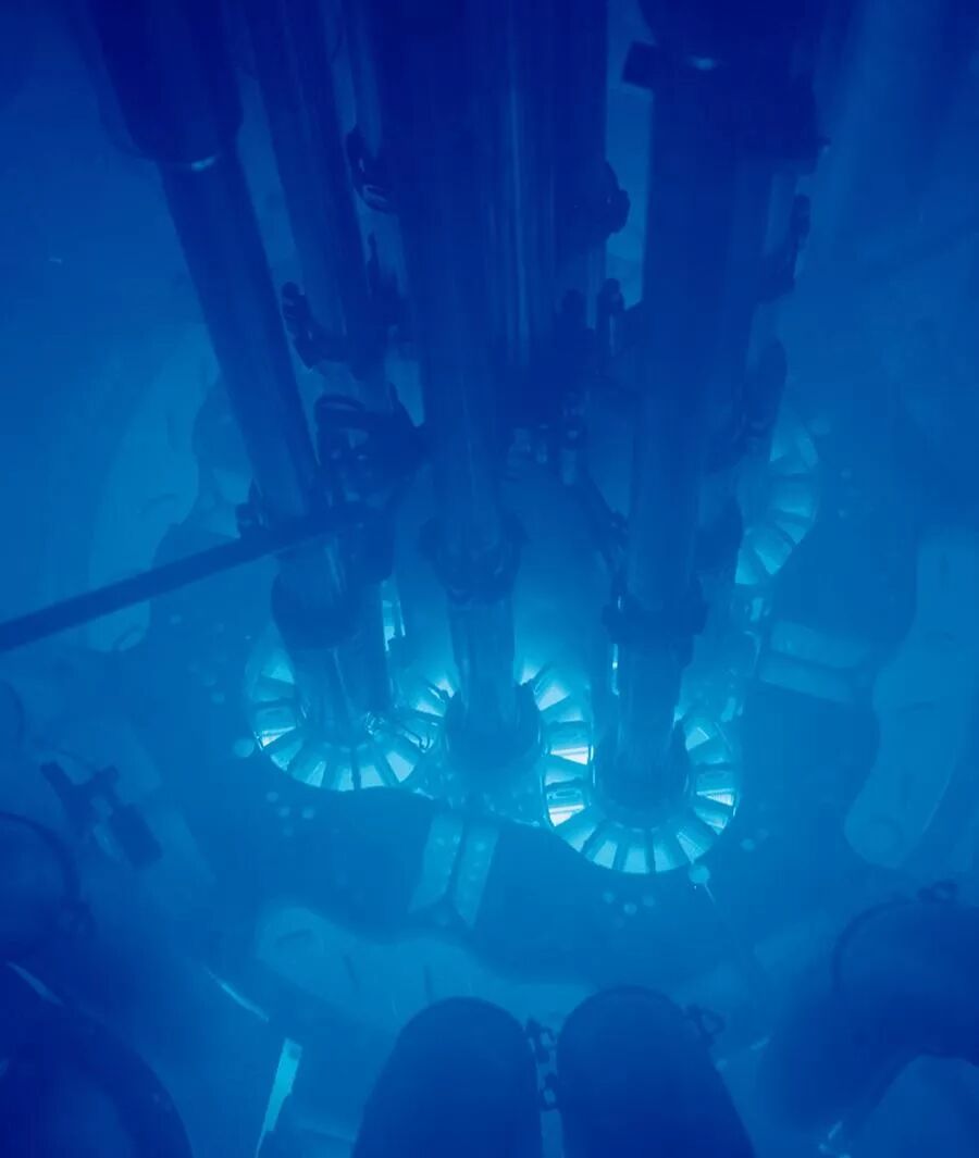 这就是爱达荷州国家实验室的高级测试反应堆中发生的事情。该反应堆侵入水中以帮助保持冷却。当电子跑赢光子时就会产生“大蓝臂”,这个以1934年发现它的苏联科学家名字命名——切伦科夫辐射。