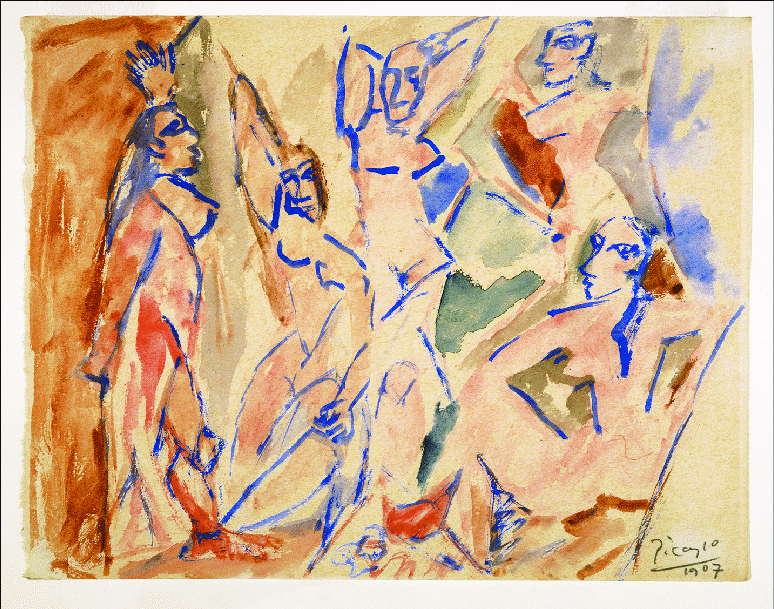 我们生活在一个三维的世界里,看着二维的画面,人人都在好奇着四维的定义和存在。如果说当时公众只是把谈论四维作为某种流行时尚的话,毕加索却认真地思索着绘画与四维空间的关系问题。在《亚威农少女》这幅杰作诞生之前,毕加索绘制了无数的草图。他进行了不断逼近科学真相的探索:如何表现第四维也就是高维?