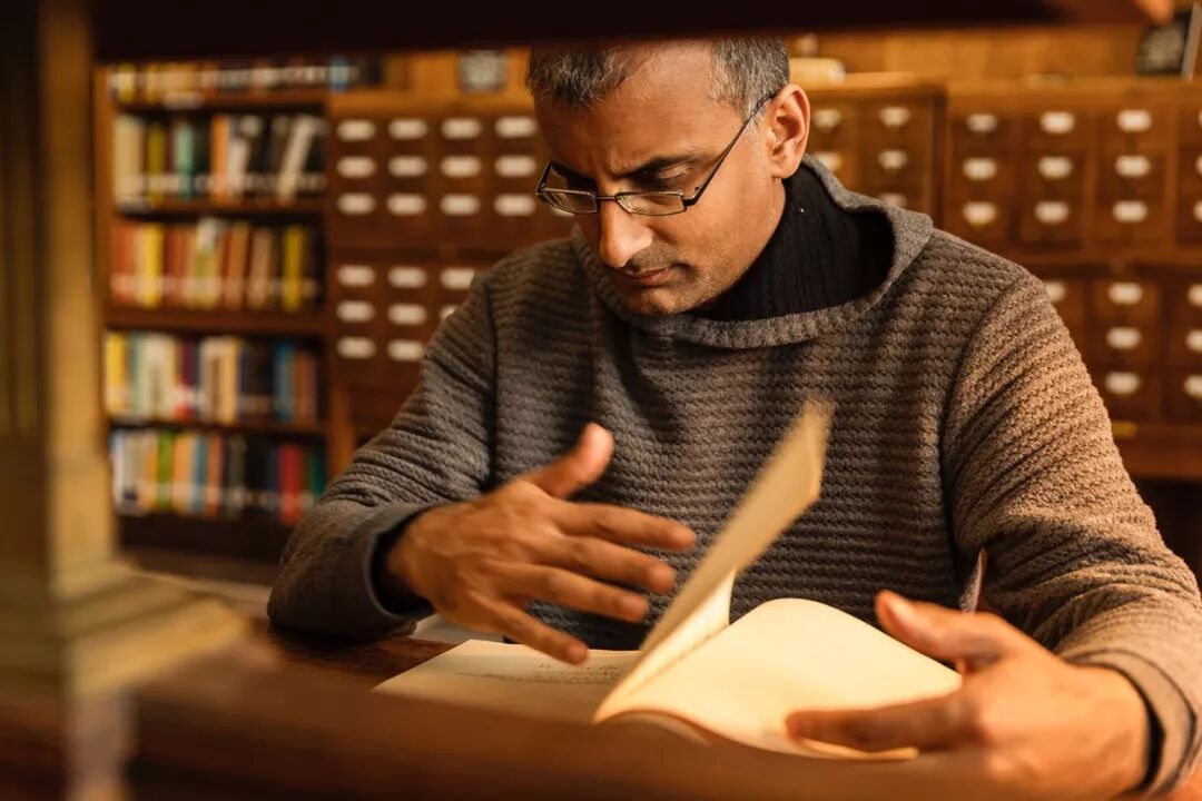 ○ 在普林斯顿高等研究院图书馆的Akshay Venkatesh。| 图片来源:Sasha Maslov