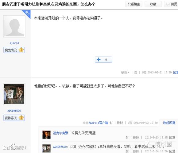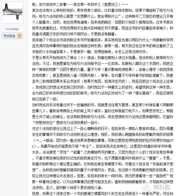 再讲讲我的经历,高一的时候我中二的加入了那个以翻译各种神论视频著称的觉醒字幕组,它喜闻乐见地把《秘密》影片翻译了,于是我就迷上了这个伪科学。那正是我的中二病最严重的时候。一开始,由于对它还是有所怀疑,我问了一下我的物理老师,结果老师说是真的。然后我就彻底迷信上了了这个东西,例如写相关摘抄啊,在网络上发宣传“吸引力法则”的帖子啊blabla的,甚至是国庆节放假把自己关在房子里花40多个小时的时间用“吸引力法则”去解释什么各种各样的中二到爆表的东西。