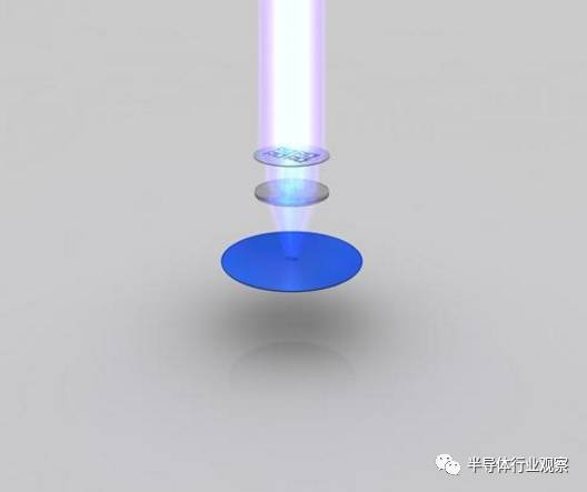 光刻胶层随后透过掩模(Mask)被曝光在紫外线(UV)之下,变得可溶,期间发生的化学反应类似按下机械相机快门那一刻胶片的变化。掩模上印着预先设计好的电路图案,紫外线透过它照在光刻胶层上,就会形成微处理器的每一层电路图案。