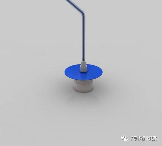 对晶圆进行光刻胶(Photo Resist),在晶圆旋转过程中浇上蓝色的的光刻胶液体,晶圆旋转可以让光刻胶铺的非常薄、平。