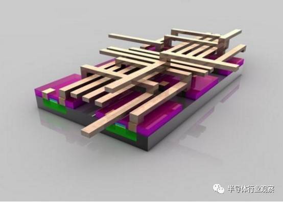 磨光后的晶圆表面下显露出金属层,铜离子金属层属于晶体管级别,大约500纳米。金属层在不同晶体管之间形成复合互连金属层,尽管芯片表面看起来异常平滑,但事实上包含20多层复杂的电路,形如未来世界的多层高速公路系统。