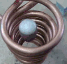 这是一个双重现象:电磁感应加热和电磁悬浮。电磁感应加热,是利用电磁感应现象,把金属放在快速变化的磁场中,从而在金属中产生涡电流。电流流经金属自己的电阻而发热,最终将金属熔化。在这里,利用交变电流通过粗大铜线圈,使用的电流功率为1.6千瓦,频率为204kHz。这枚铝块重2.6g,可以加热到1200℃,熔化是足够了。至于电磁悬浮,和上一张图原理类似,只不过现在我们有外源的电磁铁,所以可以让它一直悬浮下去。同样,铁器因为自身铁磁性的干扰所以不能做这个实验。铝和铜是最适合的材料。注意磁悬浮这现象本身不需要超导体,虽然如果有超导材料会省很多电。
