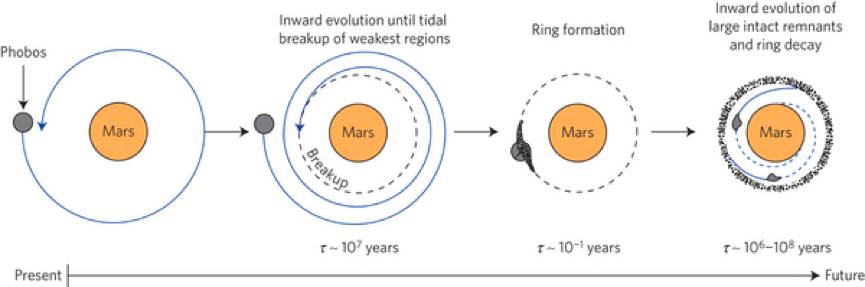 由于火卫一正在不断靠近火星,因此可以预期,在未来的某个时刻,它将进入火星的洛希极限,然后要么被撕裂,要么继续靠近火星,直到撞上火星。