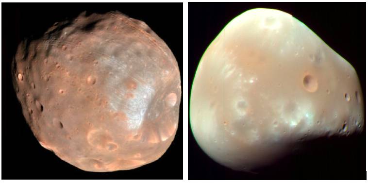 图1. 火卫一(左)与火卫二(右)的近距离图像(来源: NASA/JPL-Caltech/University of Arizona)。