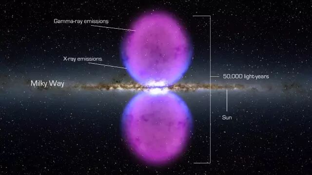 图43:费米泡(Fermi Bubbles)。在2010年九月,费米伽马射线空间望远镜在银河系发现两个伽马射线和X-射线波段的巨泡,命名为费米泡。费米泡在银河系中心上方和下方分别延伸约2.5万光年。