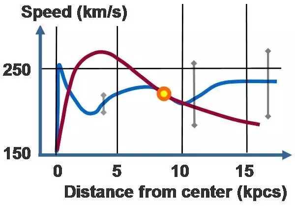图7:银河系的星系旋转曲线。纵轴是恒星绕银心得旋转速率,横轴是到银心的距离(1pc=3.26光年)。黄点代表太阳,蓝线是观测的旋转速率曲线,红线是基于观测到的恒星和星际气体从理论预测的速率曲线。