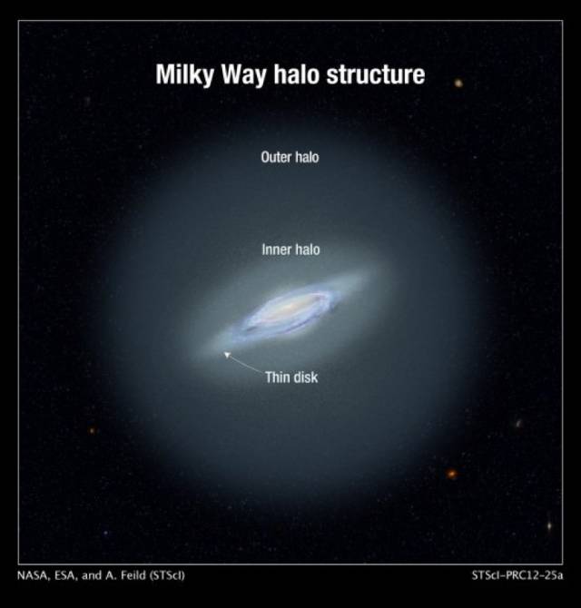 科学家们认为我们银河系90%的物质都是由暗物质所构成,这些暗物质构成了这个有点神秘的“光环”(halo,晕)。这也就是说,所有的“明物质”——即我们能够用肉眼或望远镜看到的那些物质——只构成我们银河系不到10%的成分。显然这里的“光环”并不是我们通常所想的漂浮在天使头上的那种,或者观测到彗星时看到的那种。