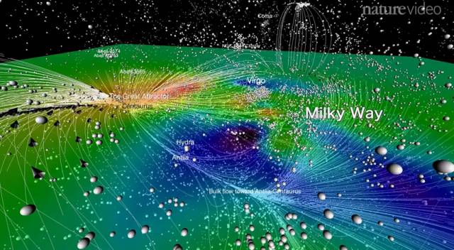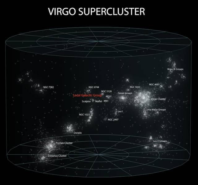 但是,本星系群也仍然只是我们近邻的一个小部分。往更远处看,我们发现银河系只是一个更大的星系群——室女座超星系团——的一部分。
