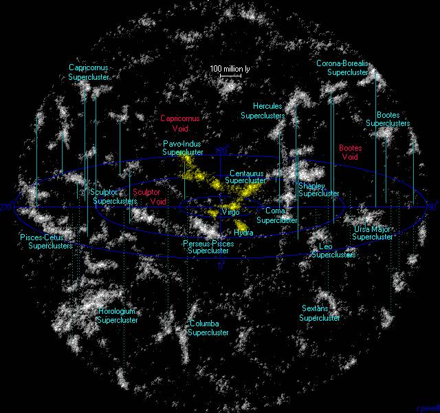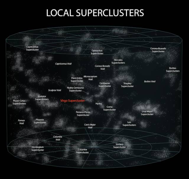 所谓超星系团,显然要比星系团更大,它包含更多的星系,尺度达到数亿光年。而在超星系团之间巨大的空间里,如果有勇敢无畏的冒险家去探险的话,遇到星系或者物质的可能性将微乎其微。