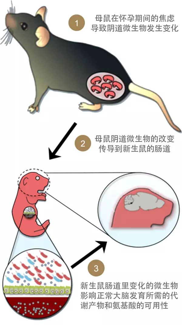 美国滨州大学的科学家Bale和团队发现,焦虑的母鼠阴道里乳酸杆菌少,而乳酸杆菌是新生小鼠肠道里重要的有益菌。母鼠不能在生产的时候通过阴道把更多乳酸杆菌传递给后代,就会让它们更容易焦虑烦躁。而这一点,对雄性小鼠的影响更为明显。