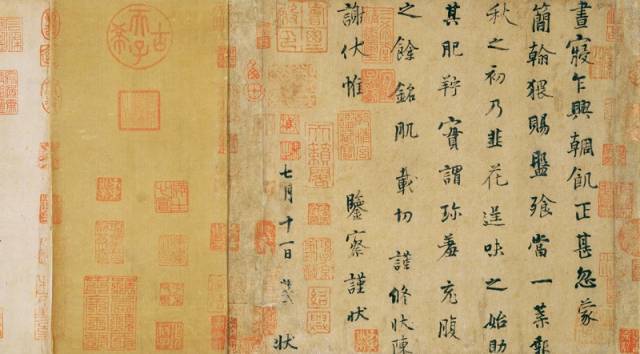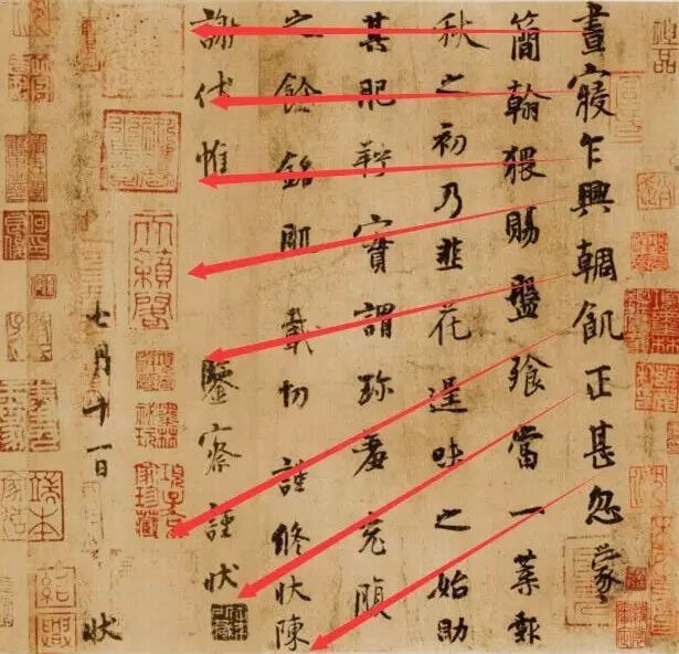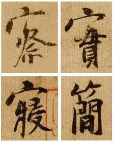 纵览帖中诸字,结构或长或扁、或收或放、或疏或密,呼应揖让一任自然,如“乍、报、韭、切”等字之极收与“秋、伏、察”等字之极放形成鲜明对比,特别是“实”字宝盖头下留出大量空间,与下部之密集点画形成强烈视觉反差,这就是杨凝式分间布白的过人之处,邓石如曰:“疏处可以走马,密处不使透风。”此帖已是表露无遗。