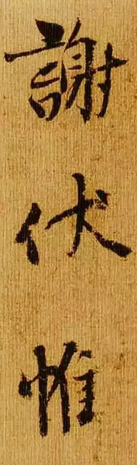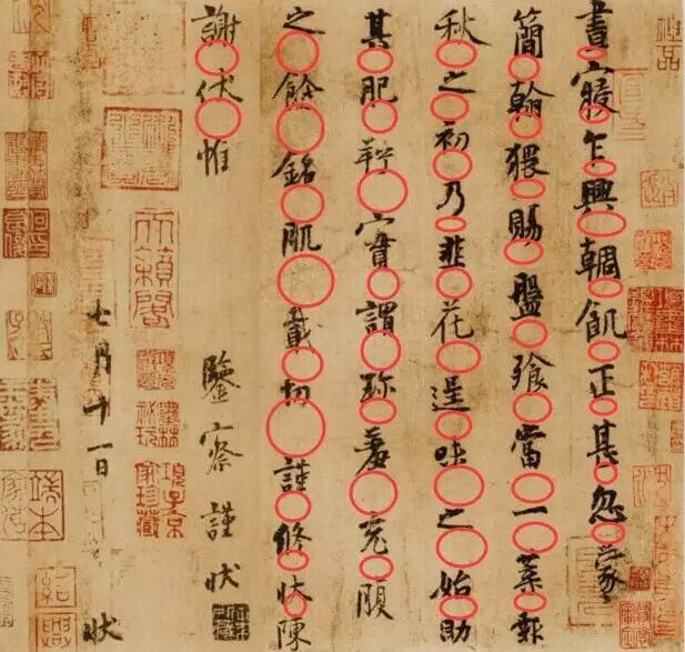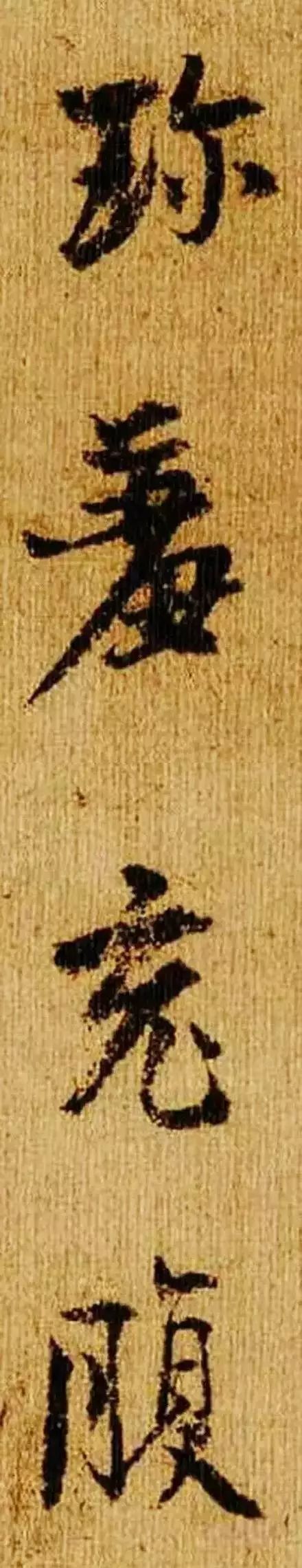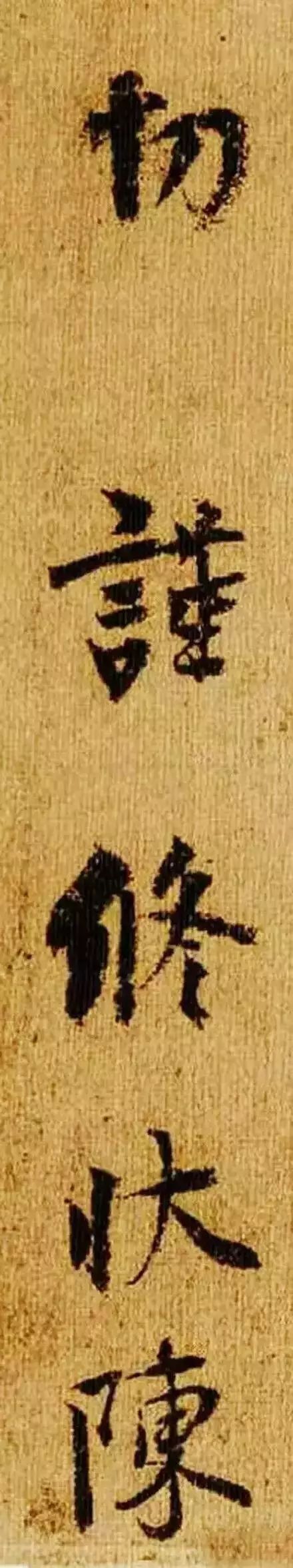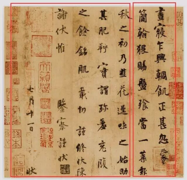 若细察单字结构的微妙变化,则各字欹侧对比,而又复归平正。如帖中第六行“伏、惟”呈纵向关系,“伏”字有明显左倾之势,而“惟”字三个竖画的支撑又使这组关系最终取得平衡,这是在欹侧对比中产生的平衡,是在不正中求正的深远的美感。