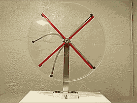 ▲达芬奇设计的永动机。他设计时认为,右边的重球比左边的重球离轮心更远些,在两边不均衡的作用下会使轮子沿箭头方向转动不息,但实验结果却是否定的。