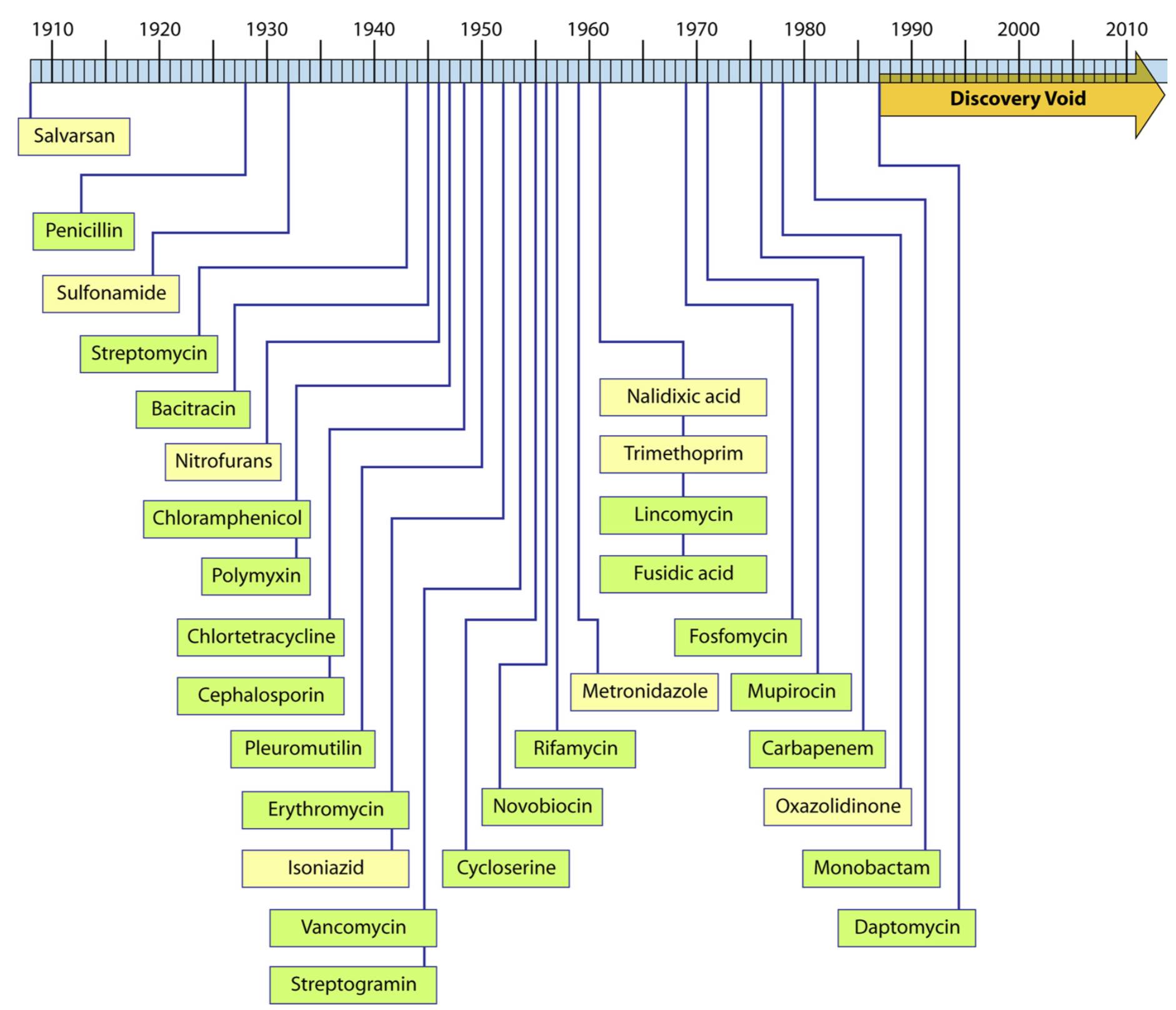 而人类发现一种新的抗生素,少则需要一两年,多则需要一二十年(4)。更要命的是,从1990年以来,人类几乎没有发现新的抗生素种类了(5)。世界卫生组织今年9月份宣布,「确认世界的抗生素频临枯竭」(6)。