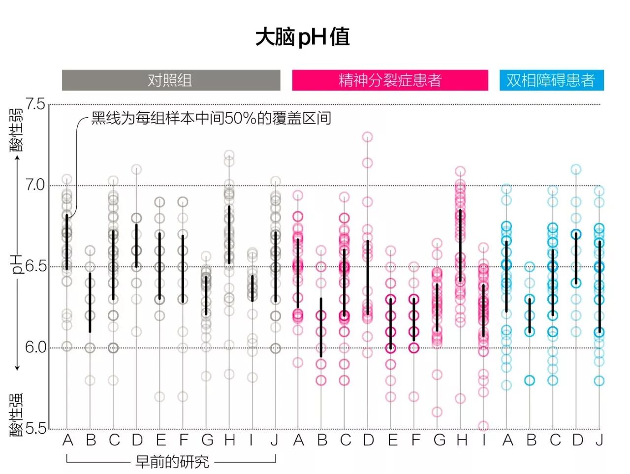 研究者分析了10个研究的数据,比较了精神分裂症、双相障碍患者和健康人死亡后大脑的酸性。总体看来,精神疾病患者大脑pH值的中列数比健康人低,这说明他们大脑中的化学成分更偏酸性。