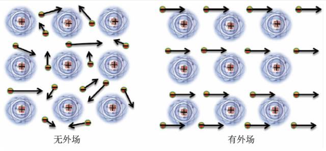 如今,人们知道,产生电阻的根本原因,在于电子在材料内部运动时会遇到各种阻碍。就像你开车上了高速公路,每每遇到收费站都可能会堵车一样,因为堵车导致整个车流变慢。电子在运动过程也要付出它自己的“买路财”,它可能发生碰撞导致能量损失,部分电子跑得慢了甚至被材料困住跑不动了(图6)。电子大军从进入材料,到奔出材料,需要一路厮杀,难免损兵折将,也难免有大量伤病,最终导致出来的电子部队不一样,这就是电阻的起源。麦克斯韦的电磁理论和法拉第的电磁场概念告诉我们,电子之所以能够运动,是因为受到了电场或磁场的作用力。在没有外电场情况下,电子在材料内部运动是杂乱无章的,无法形成固定方向的电流;但是一旦建立电场,电子就会受到一致方向的作用力,从漫天飞的状态秒变成齐步走的状态,形成方向稳定的电流(图7)。需要注意的是,电子在材料内部的运动速度并不是想象中那么快,尽管电场或磁场可以光速建立起来,但是电子毕竟有一定的质量,跑起来还是要远远低于光速。一般来说,电流传播速度指的是接近光速的电磁场速度,而非电子运动的速度。而决定电子在材料内部的运动方式,以及运动过程会受到怎么样的阻碍,关键在于材料内部电磁场的分布。至于材料内部电磁场是怎么分布的,它们又是如何影响电子的运动状态呢?直到今天,这仍然是物理学的主要研究内容之一[6]。