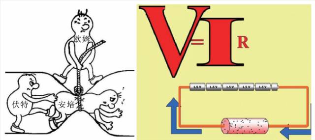 乔治·欧姆选择了伏特电堆作为电源,就这样,匆匆几年过去了,他从一堆数据里勉强凑出来一个规律。也许是因为他急于表现自己的科学能力,也不知道是不是他们的中学评职称要求论文数目,反正欧姆老师很快把他的初步实验结果发表了。但不幸的是,他随后发现无法重复实验结论,显然之前的研究还有问题,只是覆水难收,论文都发出来了,除了被大家嘲笑不专业瞎搞,估计也就那样了。有幸的是,一位正直的科学家发现了这位中学教师的努力,他鼓励欧姆不要这么快放弃自己的理想,并给出了一个关键性的建议:伏特电堆的电压并不是特别稳定,这会直接影响电流的测量结果,不如采用更加稳定的温差电池。所谓温差电池,是由德国另一位物理学家塞贝克发明的,他于1821 年发现金属两端温度不一样的时候,就会产生电动势,形成电流,温差越大,电流越大。由于温差电池是靠温差驱动,只要保持两端的温度不变(如一头沸水,一头冰水),输出的电流就能稳定。可怜的欧姆,为了追逐自己的科学之梦,天天在冰火两重天的实验室猛干(图4)。终于,积累了大量的数据之后,乔治·欧姆发现了一个非常简单的线性规律:通过金属的电流强度和它两端的电势差成正比。因此,衡量金属导电能力可以用通过它的电流强度和电势差的比值来定义,即是电导,表示传导电流能力;两者反过来相除,就是电阻,表示阻碍电流能力(图5)。欧姆还发现金属导线的横截面积越大,长度越短,导电能力越好,也就是说,电阻与长度成正比且与横截面积成反比,这点在情理之中[4]。