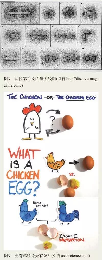 然而,究竟是先有磁,还是先有电呢?如同一个古老争论不休的问题,究竟是先有鸡,还是先有蛋呢?很多人认为当然是先有蛋再有鸡,因为原则上鸡和鸟类一样,都是恐龙进化而来,想当年恐龙时代,大伙都下蛋,就没有听说过什么叫做鸡!但是最近英国科学家发现有一种蛋白质只能在鸡的卵巢里产生,这下还是先有鸡比较靠谱。也就是说,得先有个叫做“原鸡”的动物,下了一个蛋,叫做“鸡蛋”(图6)。那么,有没所谓的“原磁”或“原电”呢?这才是产生电或磁的根源?