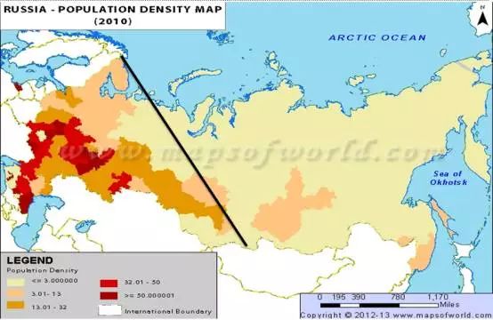 俄罗斯的“胡焕庸线”是一条近似斜线,基本分割了俄罗斯的欧、亚地区和南部地区。俄罗斯欧洲部分人口,占了全国的75%。