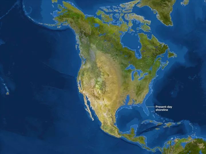 先来看北美洲,整个佛罗里达半岛全部沉浸在海水里。