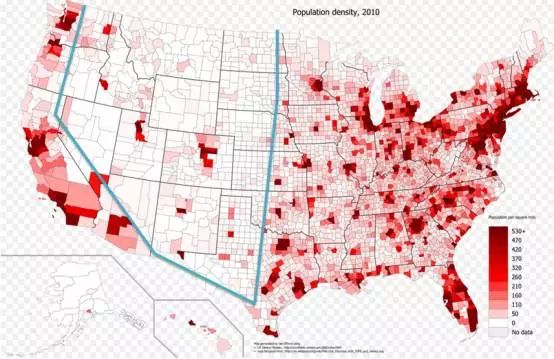 其他国家其实也存在这样的地理分割线,比如美国的人口密度分割线是一个不规则的U型线。算上阿拉斯加、夏威夷及其它的一些海外领地,U型线内外的面积大约为50%对50%,人口比例为14%:86%,GDP比例约为11%:89%。虽然比例没有中国的悬殊,但地域分布也是十分不均。