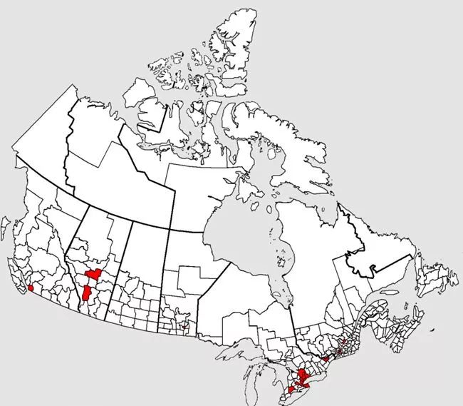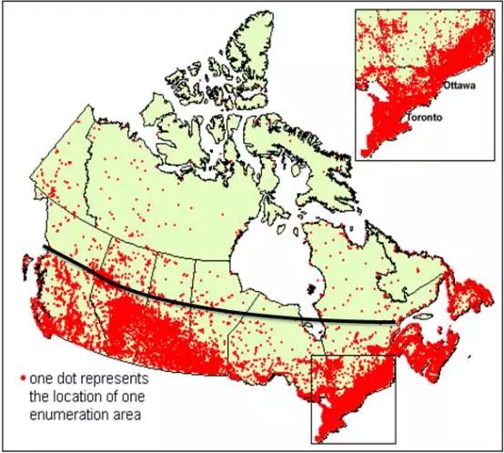 加拿大就更不用说了,超过90%的加拿大人口居住在距离美国边境250公里以内的南部地区,因此加国的“胡焕庸线”也大致位于此线附近。