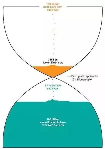 以整个地球史来看,下图每一个点就代表1000万人,每年有1.4亿人诞生,每年有5700万个人死去,估计曾有1080亿人在地球上活过并死去。