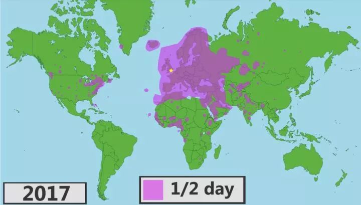 当下,同样从伦敦出发到达图中紫色区域的任何一地,最多只需要半天时间。