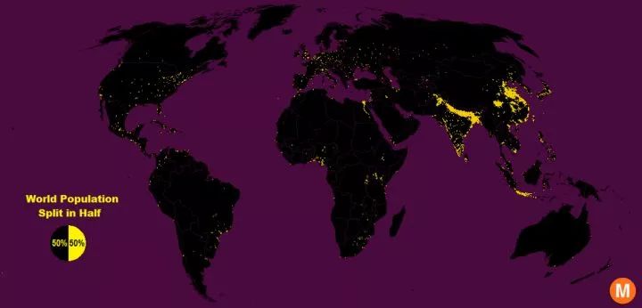 世界上有一半的人口居住在下图中的黄色区域,同样,世界上的另外一半的人口,居住在黑色区域。