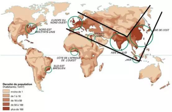 连世界的“胡焕庸线”都可以简单粗暴地概括为“深V地带”,该地带内的西欧、印度、中国是世界人口最稠密的地方。当然,还有美国、埃及北部、西非、巴西东南岸、东南亚爪哇等人口聚集地。