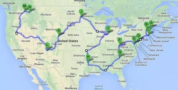 想要以最短的路线,走遍美国本土的48个州,下图是具体的路线。