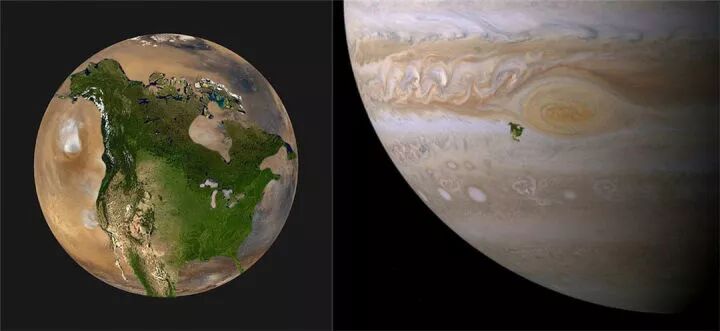 北美洲面积约2400万平方公里,在七大洲中排第三,如果把北美洲放到火星(左图)和木星(右图)上,分别是这样的。